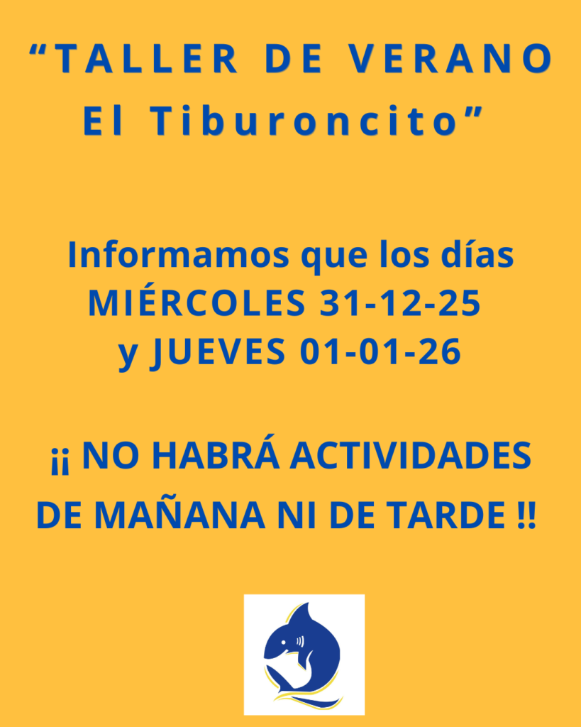“taller de verano el tiburoncito”Noticias Informamos que los días Miércoles 31/12/25 y Jueves 01/01/26 no habrá actividades en el “Taller de Verano El Tiburoncito” en ninguno de los dos turnos: mañana y tarde.